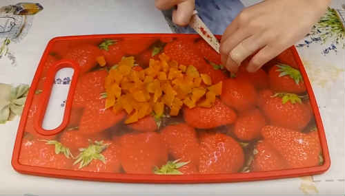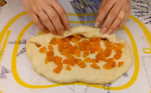 З найбільшою частиною тіста проробіть ті ж маніпуляції, тільки всередину покладіть курагу. Форму для запікання потрібно взяти відповідного розміру.