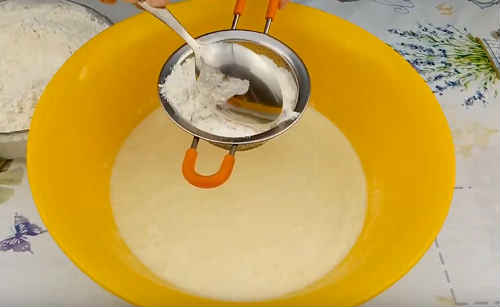 Почніть підсипати борошно, попутно її просіваючи. Не поспішайте засипати відразу все кількість, інакше грудочки буде складно розбивати.
