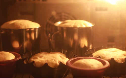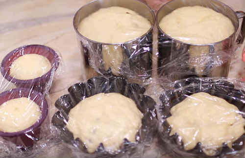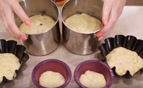 Промажте маслом формочки. Розподіліть тісто, наповнивши ємності наполовину. Знову накрийте, залиште на расстойку.