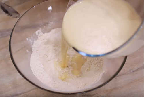 Просіяне борошно насипте у велику миску, зробіть невелике заглиблення. Почніть потихеньку підливати опарную суміш. Одночасно активно помішуйте, розбиваючи грудочки. Не поспішайте заливати відразу все кількість, додавайте поступово.