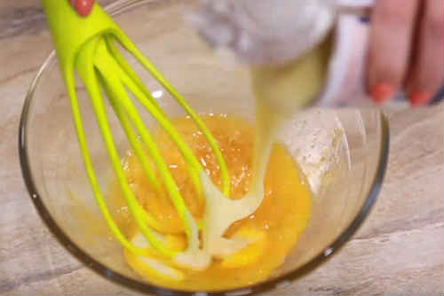 Викладіть в миску відокремлені жовтки, трохи розколотіть віночком. Перелийте до жовтків згущене молоко. Продовжуйте збивати, поки суміш не стане однорідною.
