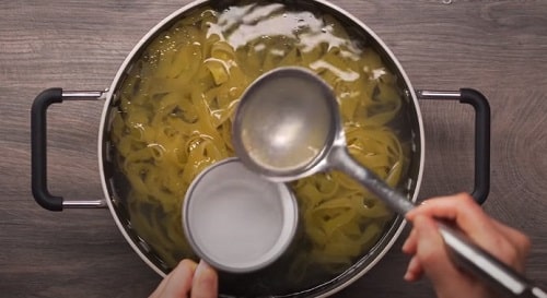 Поставте варитися пасту, залив в каструлю 1,5 літра води на вказане в складі рецепта кількість макаронних виробів. Обов'язково підсолити і хлюпніть крапельку оливкової олії, щоб вони не злиплися. Час варіння подивіться на упаковці, для кожних макаронів воно різне. Готуйте на хвилину-півтори менше, до стану аль-денте.