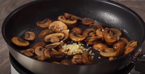 Розведіть смажені гриби, киньте залишилися 10 гр. масла. Викладіть рубаний в дрібну крихту часник. Поперчіть блюдо, посоліть. Розмішайте вміст, готуйте ще з хвилинку.