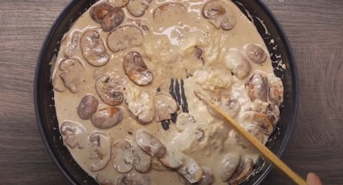 Розмішайте грибний соус. Не зменшуючи вогню, тушкуйте ще 3 хвилини. Соус стане густим, тягучим.