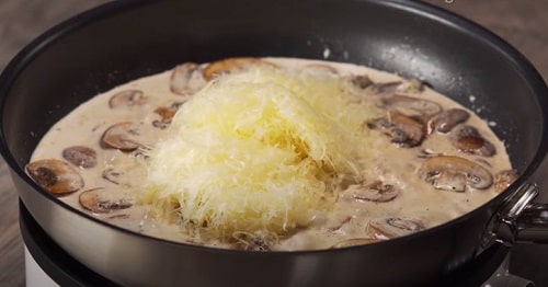 Натріть сир крупною стружкою, відправте на сковороду. А при відвар, що залишився після приготування пасти.