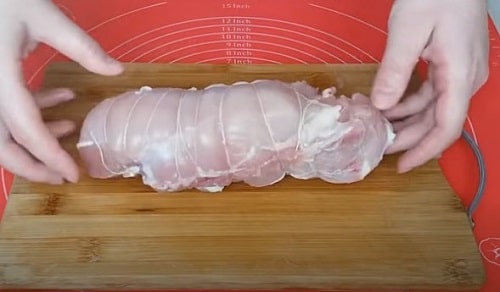 - Рясно змастіть м’ясо, розітріть по поверхні філе. Зв’яжіть філе разом щільними нитками. Потримайте приблизно годину, відправивши в холодильник.
