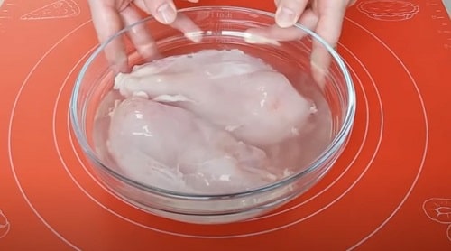 Промийте куряче філе, опустіть в розчин. М’ясо просолится, попутно насититься водою і стане соковитіше. Потримайте заготівлю 1,5-2 години.