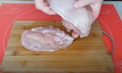 - Видаліть з курки шкіру, плівки, поділіть цілу грудку на половинки.