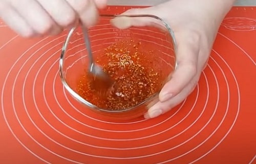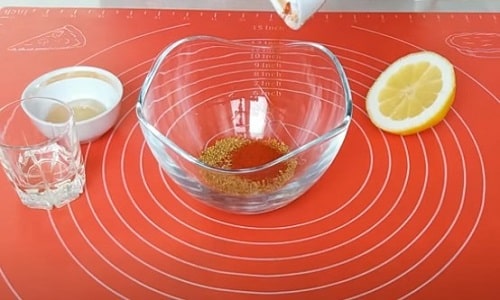 - У невеликій посудині з’єднайте інші перераховані в рецепті інгредієнти (приправи). Перемішайте, рясно промажте курячі грудки. Потримайте достатнього для маринування 15-20 хвилин.