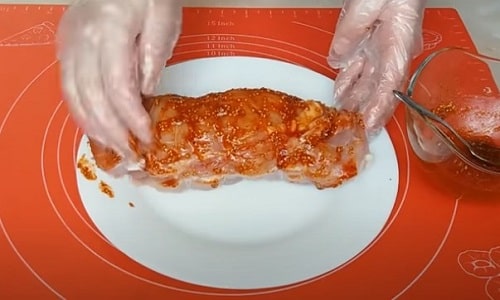 Щедрою рукою промажте маринадом заготовку з усіх боків. Залиште на 2-3 години при кімнатній температурі. Якщо маєте часом, краще відправте напівфабрикат на полицю холодильника і потримайте ніч.