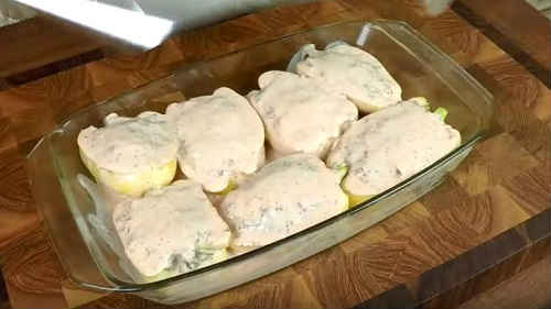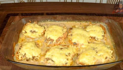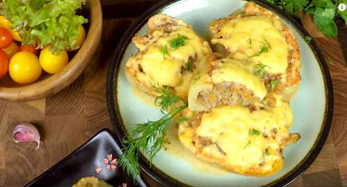 Поверніть фаршировку в духовку. Дочекайтеся, коли сир розплавиться. Любите рум’яну скоринку – потримайте довше. Подаючи, посипте блюдо рубаною зеленню.