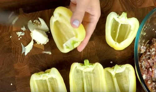 Підготуємо перці. Поділіть на половинки, вичистити насіння з перегородками. Хвостик можна залишити, для краси і зручності (щоб брати фарширований овоч в руки).