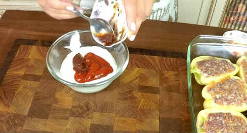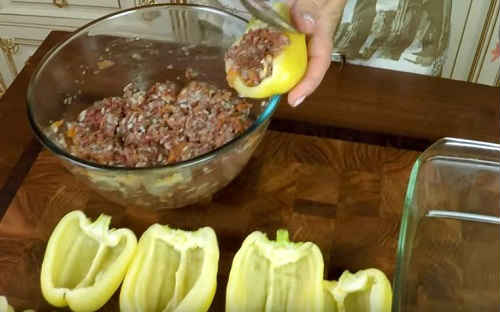 Наповніть фаршем заготовки перцю, щільно утрамбуйте масу, як на фото.