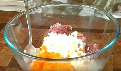 Відразу підсолити вміст, здобріть меленим перцем. Гарненько перемішайте до єдиної маси.