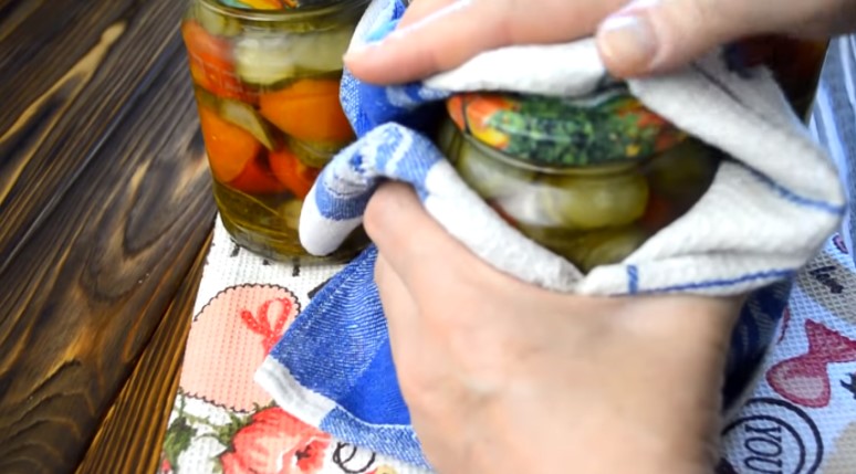 7. Готовий салат закатуємо, перевертаємо з ніг на голову, накриваємо зверху рушником до остужения продукту.