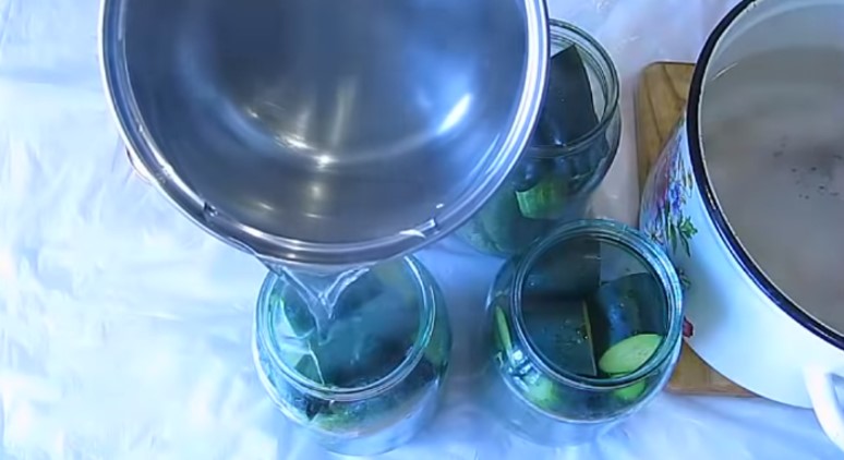 5. Дно широкої посудини застеляємо рушником, ставимо закуску і заливаємо теплою водою по плечики склотари. Кип’ятимо 10 хвилин.