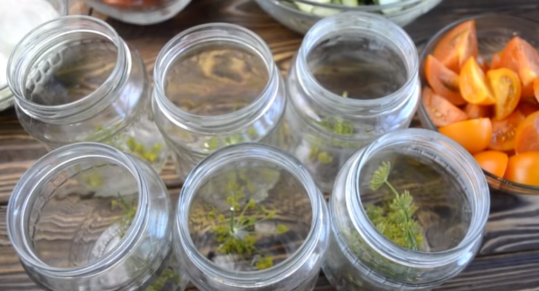 2. Промиту содовим розчином склотару стерилізуємо, після цього на дно кладемо перець і парасольки кропу.