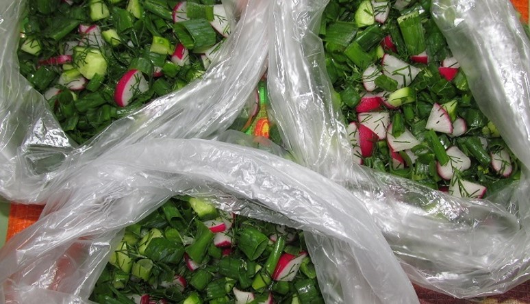 6. Овочева суміш розфасовується по пакетах або пластикових контейнерах. Не потрібно складати все в одну тару, фасувати найкраще невеликими порціями. Потім із заготівлі, на скільки це можливо, випускається зайве повітря, пакети зав’язуються і забираються в морозильну камеру.