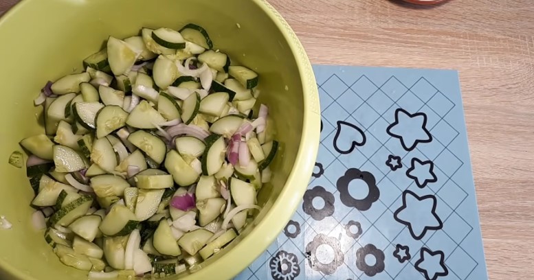 2. Вся нарізка перекладається у велику ємність, до неї додаються залишилися інгредієнти. Суміш добре перемішують і залишають на 3-4 години, щоб овочі віддали частину соку. При цьому раз на півгодини потрібно розмішувати заготовку.