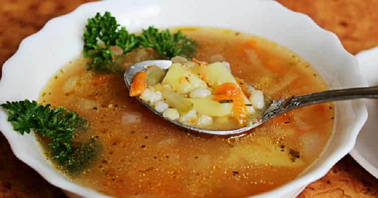 Відваріть бульйон. Промийте, почистіть і подрібніть всі овочі, відправте до бульйону. З крупи злийте воду і відправте туди ж. Час варіння півгодини. Перед закінченням варіння додайте сіль, перець, інші спеції за бажанням. При подачі додайте в порційну тарілку сметану.