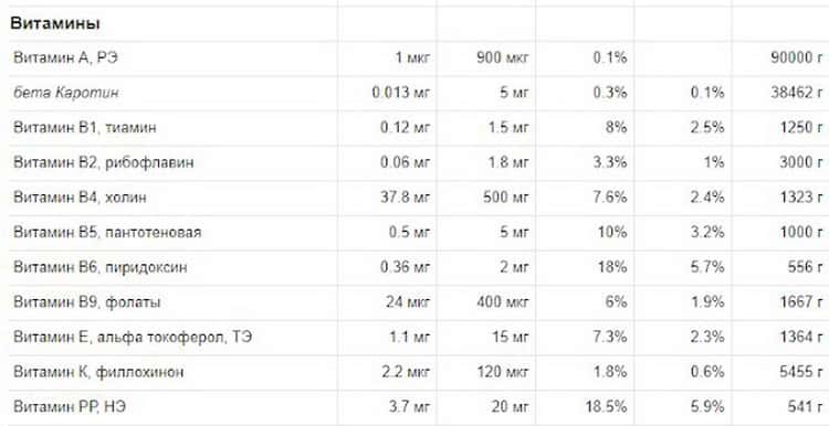 - З мікроелементів містить залізо, кобальт, марганець, селен. Пропонуємо розглянути детальну таблицю складових в 100 г продукту, щодо добової норми для людини.