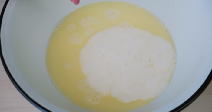 1. У глибокій посудині за допомогою виделки або віночка розбиваємо яйце, не потрібно збивати, достатньо буде з’єднати жовток з білком. Потім додаємо молоко, сіль і масло, суміш добре перемішуємо. Додаємо соду, знову перемішуємо і вливаємо оцет. Доводимо інгредієнти до однорідності, поки йде реакція гасіння соди.