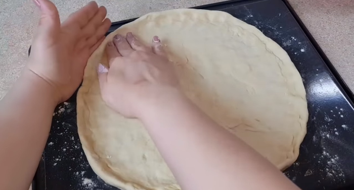 6. Коли пласт придбає потрібну форму, переносимо його на деко, посипаний борошном, і за допомогою рук робимо бортик, як це показано на фото.