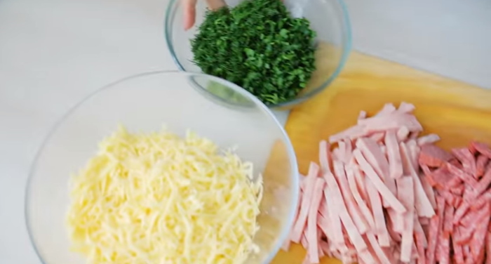 3. Всі продукти для начинки нарізаємо брусочком, сир натираємо на крупній клітинці терки.
