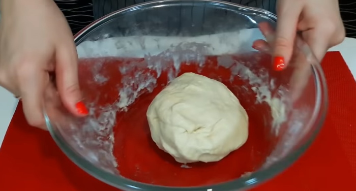 4. Потім готове тісто загорніть в плівку або помістіть в миску і накрийте вологим кухонним рушником, залиште на 2-2,5 години. Дочекайтеся, поки тісто не подвоїться в об’ємі.
