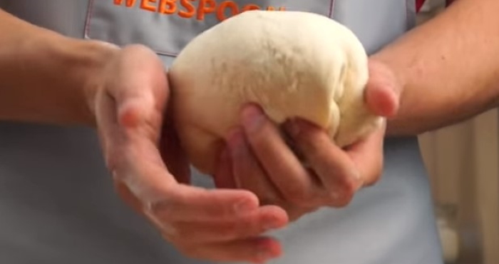 5. Збільшене в об’ємі тісто розділіть на чотири рівні частини, сформуйте в кульки і накрийте ще на півгодини. Нарешті, розтягніть тісто для піци руками по формі для випічки, бажано не використовувати качалку, інакше ви видавіть все повітря з тіста.