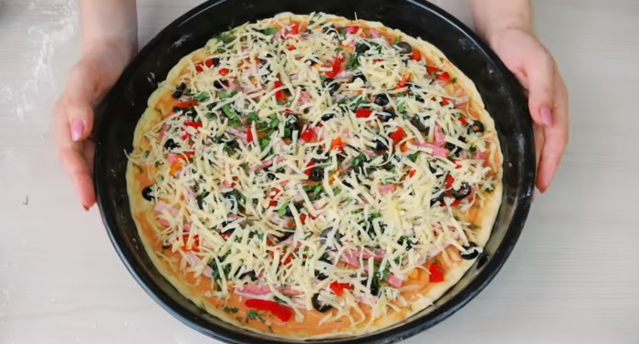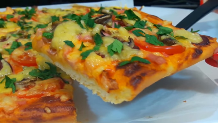 Самостійно приготовлена піца на тонкому бездрожжевом підставі з улюбленими добавками, а смак як з кращої італійської піцерії. Тісто виходить тонка і хрустке, тобто таке, як і повинно бути.