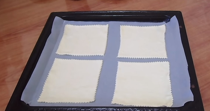 3. Коли пласти стануть кімнатної температури, включаємо духовку для розігріву до 200 градусів. Деко для випічки застеляємо пергаментом. Тісто розгортаємо в пласт товщиною 2-3 мм, розрізаємо на 4 квадрати, які викладаємо на папір.