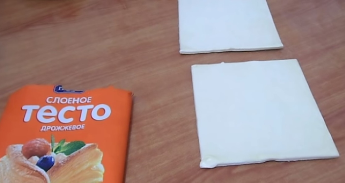 1. Приготування почнемо з розморожування тесту. Для цього його потрібно дістати з упаковки, розкласти на сухий робочої поверхні і дочекатися поки пласти не стануть кімнатної температури.