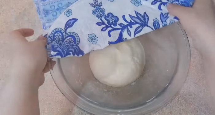 4. Після «відпочинку» тісто стане м’яким і податливим, тому вимішуємо його до однорідності протягом 10 хвилин. Утворився клубок накриваємо рушником і ставимо в тепле місце на 40-50 хвилин.