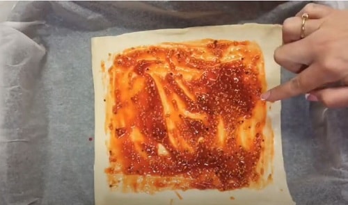Покладіть на квадрат кетчуп і зернову гірчицю. Розподіліть по тесту, зробивши з країв невеликі відступи.