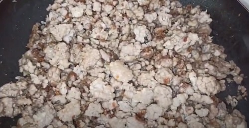 Налийте на сковорідку масло, розігрійте його. Викладіть фарш. Почніть обсмажувати, розбиваючи лопаткою на більш дрібні фракції.