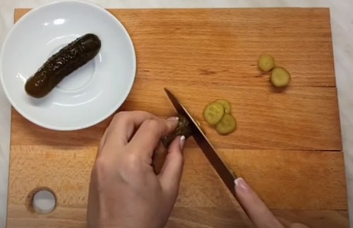 Наріжте солоні огірочки кільцями.