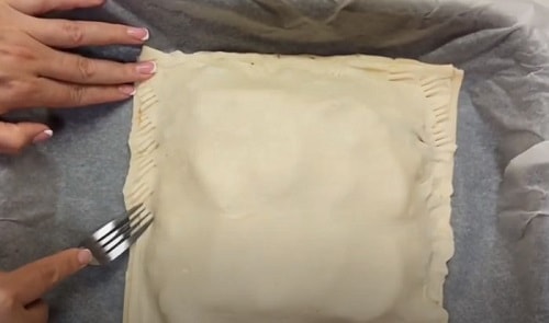 Накрийте пиріг другим квадратним пластом тіста. Защипайте краю, пройдіться вилочкою, для надійності кріплення і красивого виду Чізбургера.