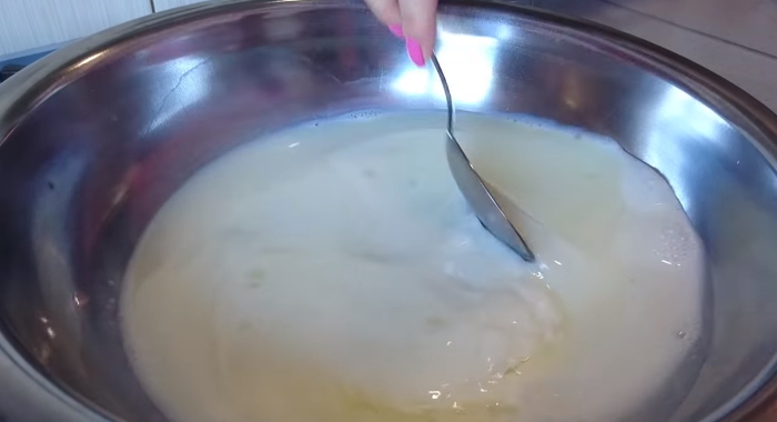 2. Коли суміш молока і цукру охолоне приблизно до 40 градусів, у неї додаємо дріжджі і починаємо вводити невеликими порціями заздалегідь просіяне борошно.