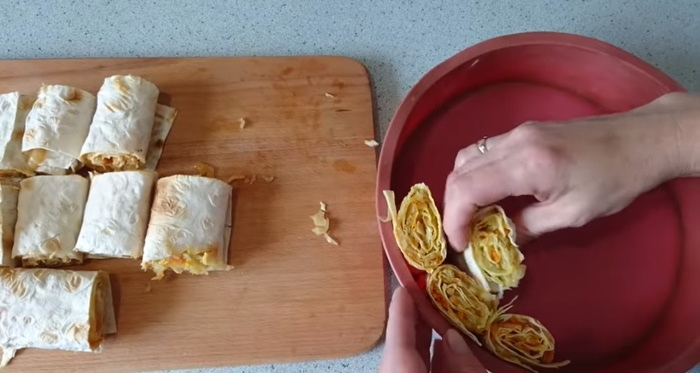 4. Лаваш розрізаємо на невеликі однакові за розміром частини.