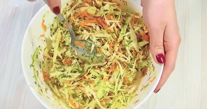 2. Овочі миємо, капусту шаткуємо, моркву натираємо, якщо використовуються варені яйця, їх треба порізати на невеликі шматочки. Кріп миємо, стряхиваем воду і подрібнюємо.