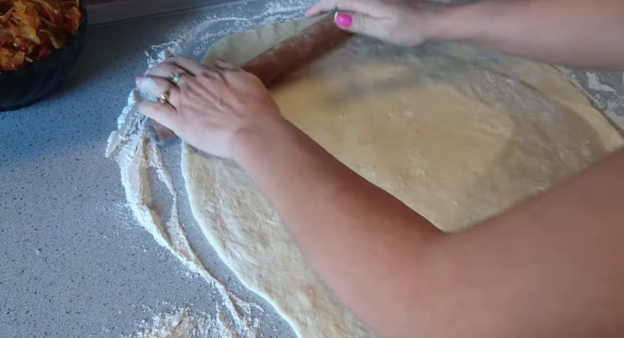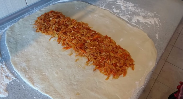 6. По центру пласта викладаємо приготовлену раніше начинку з капусти.