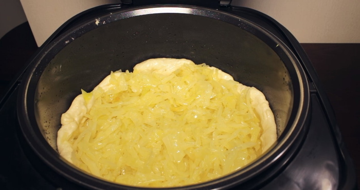 5. Рештою тестом закриваємо пиріг, з’єднавши краї нижнього і верхнього шару. Готувати страву будемо в закритому приладі на режимі «Мультиповар» протягом години при 125 градусах.