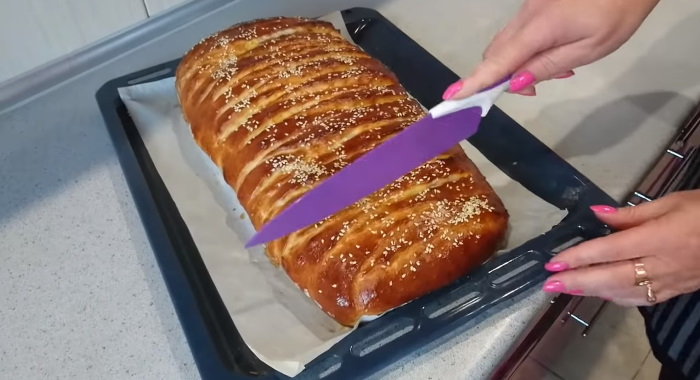 7. За допомогою фігурного або звичайного ножа робимо розрізи з обох сторін, рухаючись навскоси. Цілісний край пласта загортаємо і починаємо «заплітати» ласощі, створюючи кулінарну красу.
