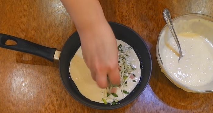 3. ½ Частину тіста наливаємо у холодну сковороду, змащену олією. Зверху рівномірним шаром розкладаємо начинку.
