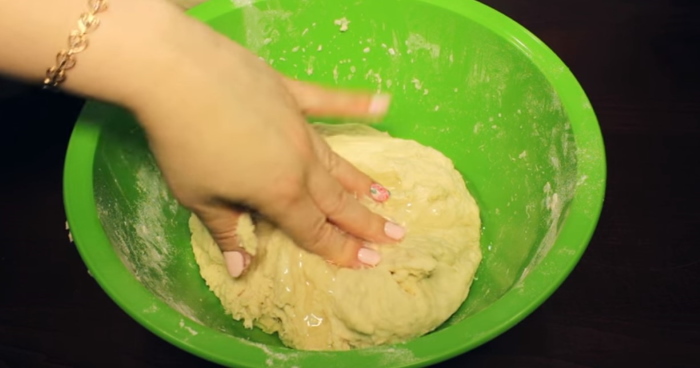 1. Для приготування тіста всі продукти змішуємо в глибокій мисці (виняток робимо тільки для масла, використовуючи в замісі 3 ложки). Готове тісто повинно мати м’яку структуру і липнути до рук. Після цього в нього вливаємо олію і вимішуємо до однорідності. Накриваємо Миску рушником і залишаємо мінімум на півгодини.