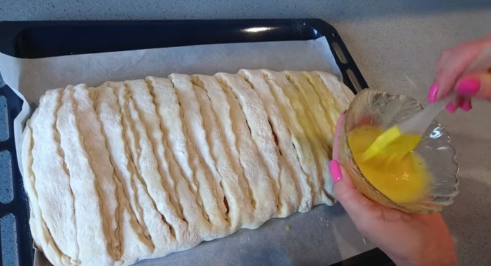 8. Виріб на пергаменті переносимо на деко, верх змащуємо яйцем і ставимо в розігріту до 180 градусів духовку на півгодини.