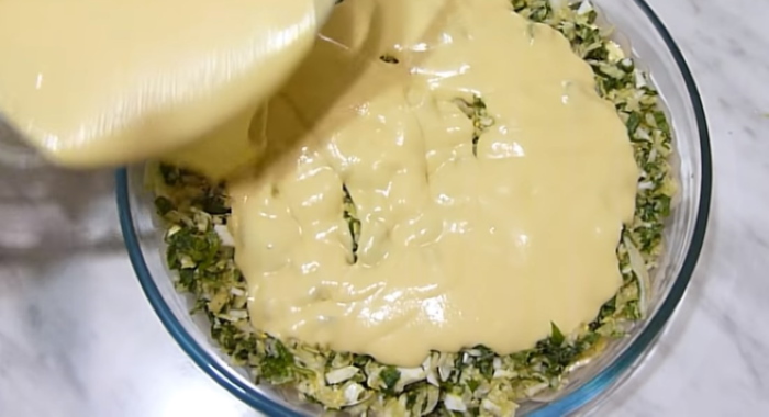 2. Для приготування, деко або вистилаємо форму папером для випічки або харчовою фольгою. По дну розкладаємо начинку, яку заллємо отриманим тестом, розподіливши його по всій поверхні овоча, і проткнем заготовку в декількох місцях, щоб тісто змогло проникнути до дна крізь начинку.