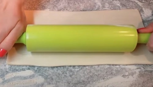 Разморозьте лист тіста. Припудрите стільницю борошном, викладіть лист, розкачайте. Розкочуйте в одному напрямку, щоб не порушити слоистость тесту, це важливо.