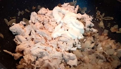 Через пару хвилин заправте начинку сметаною. коли вміст закипить, зменшіть потужність вогню до мінімуму. Тушкуйте під кришкою при тихому кипінні приблизно 5 хвилин. Якщо в начинці з'явиться занадто багато рідини, зніміть кришку і випарити її. Курка з грибами повинні бути розсипчастими.